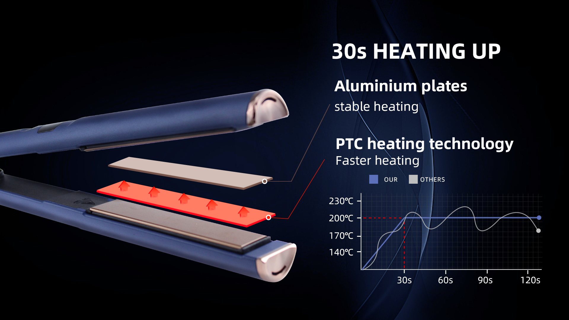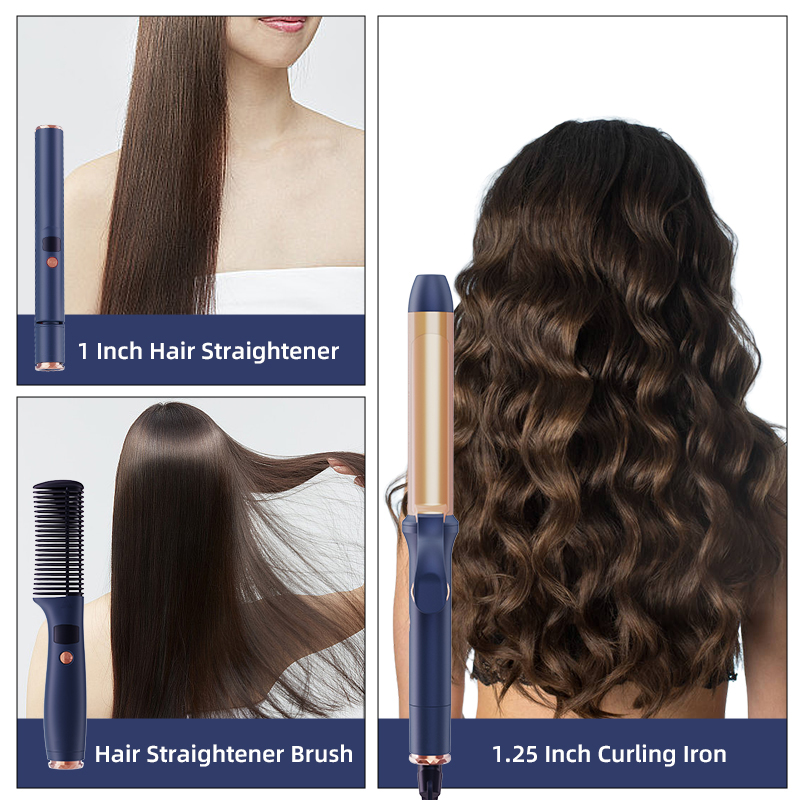 This 3 in 1 hair styling set includes a 1 Inch hair straightener, a 1.25 Inches curling iron and a hair straightener brush. With the detachable power cord, a single power cord can control three devices, which saves a lot of space. With this set of styling tools, you can achieve various hair designs.