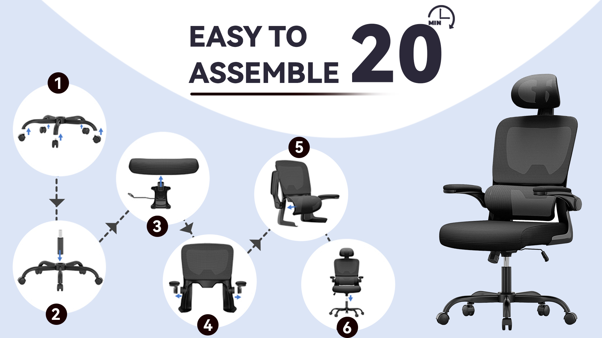All the necessary parts, hardware and easy-to-follow instructions are included in the package for simple 6-step setup within 20 minutes. This ergonomic computer chair is built of plastic & mesh back, foam-padded seat, SGS-certified pneumatic cylinder and nylon base & wheels. Capable of holding up to 150kg/300lb