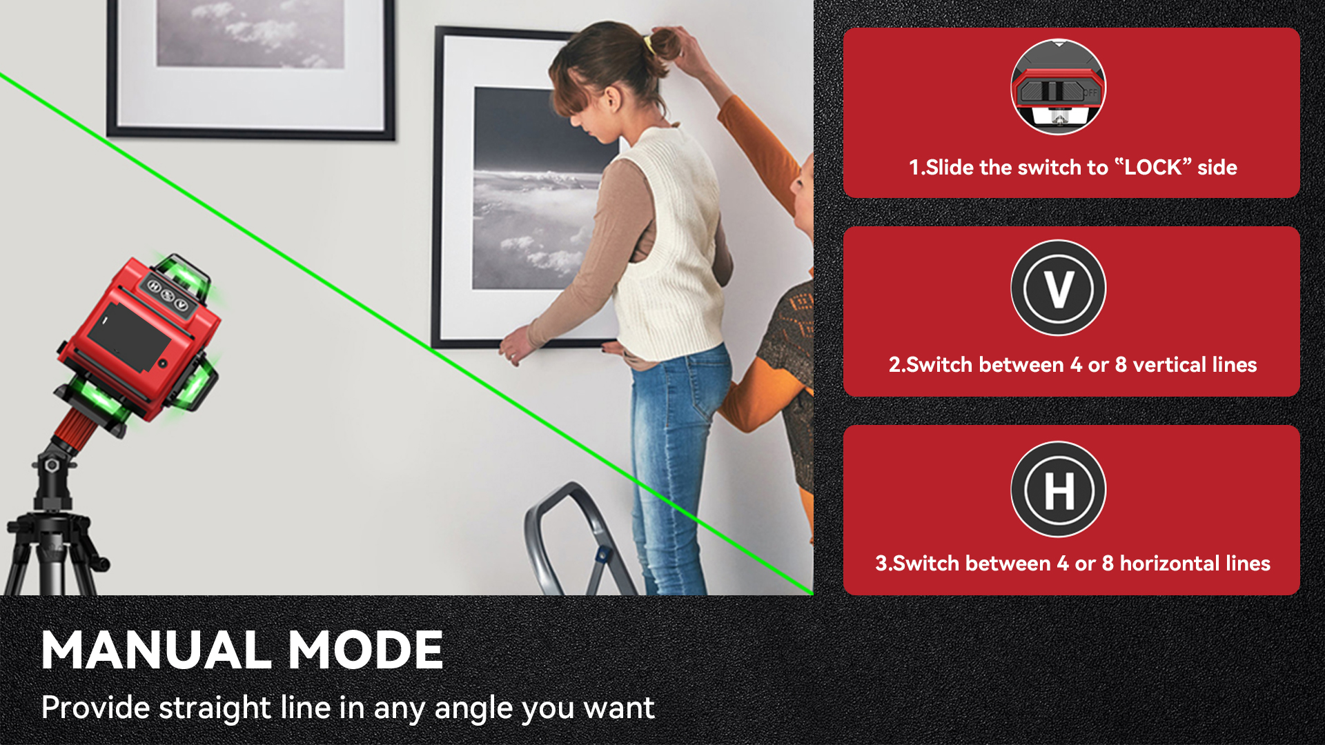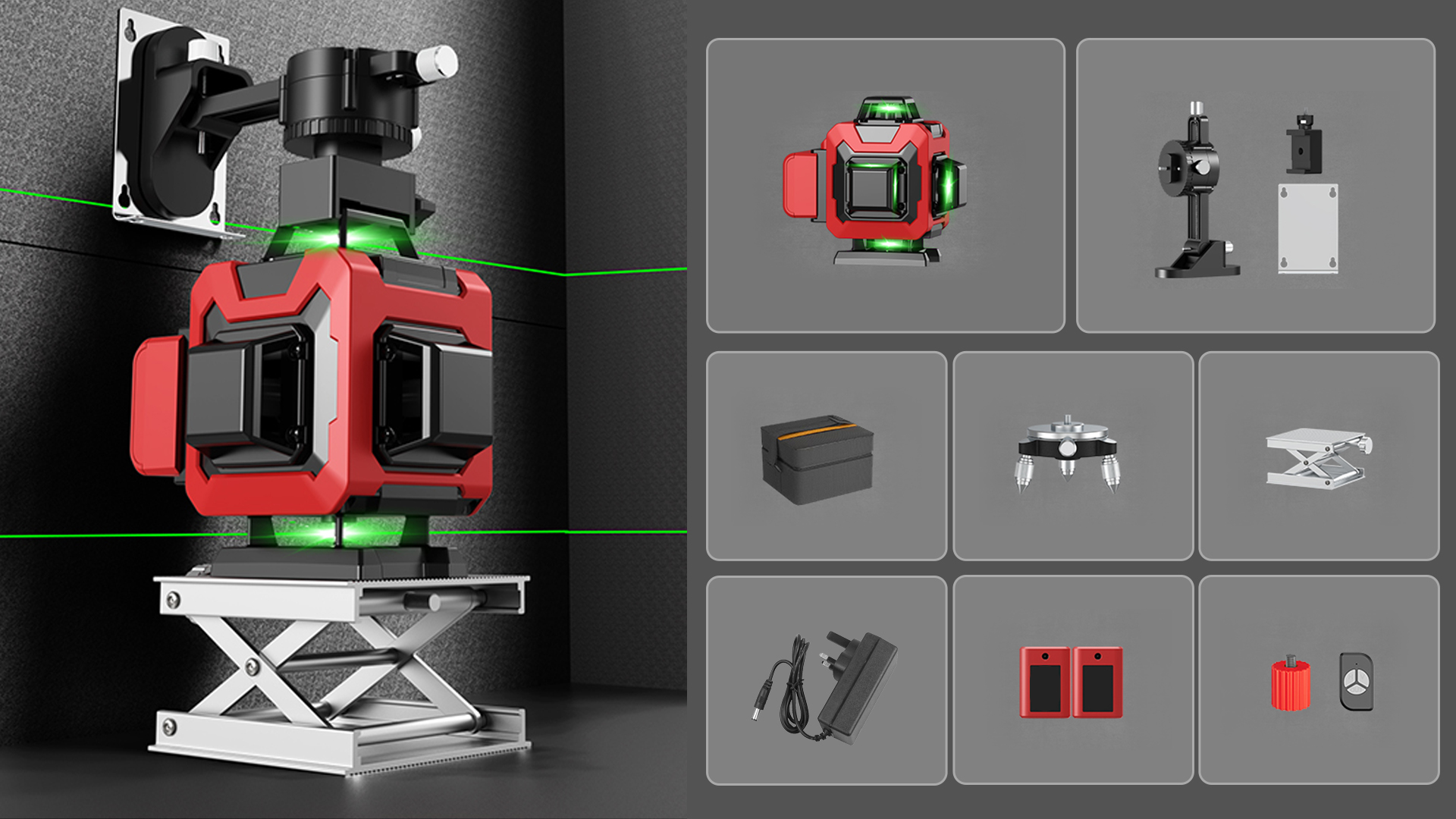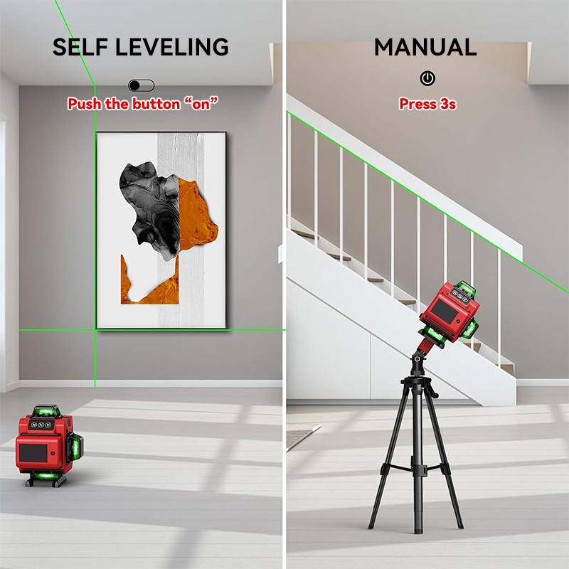 Our laser level includes advanced features like a self-leveling function, versatile mounting options, and an extended projection range, which makes it an essential tool for a wide range of projects. The device ensures perfectly straight and level lines, eliminating the need for manual adjustments or traditional bubble levels, saving time and effort. Just set it up, and the self-leveling mechanism will automatically adjust to ensure accurate measurements.