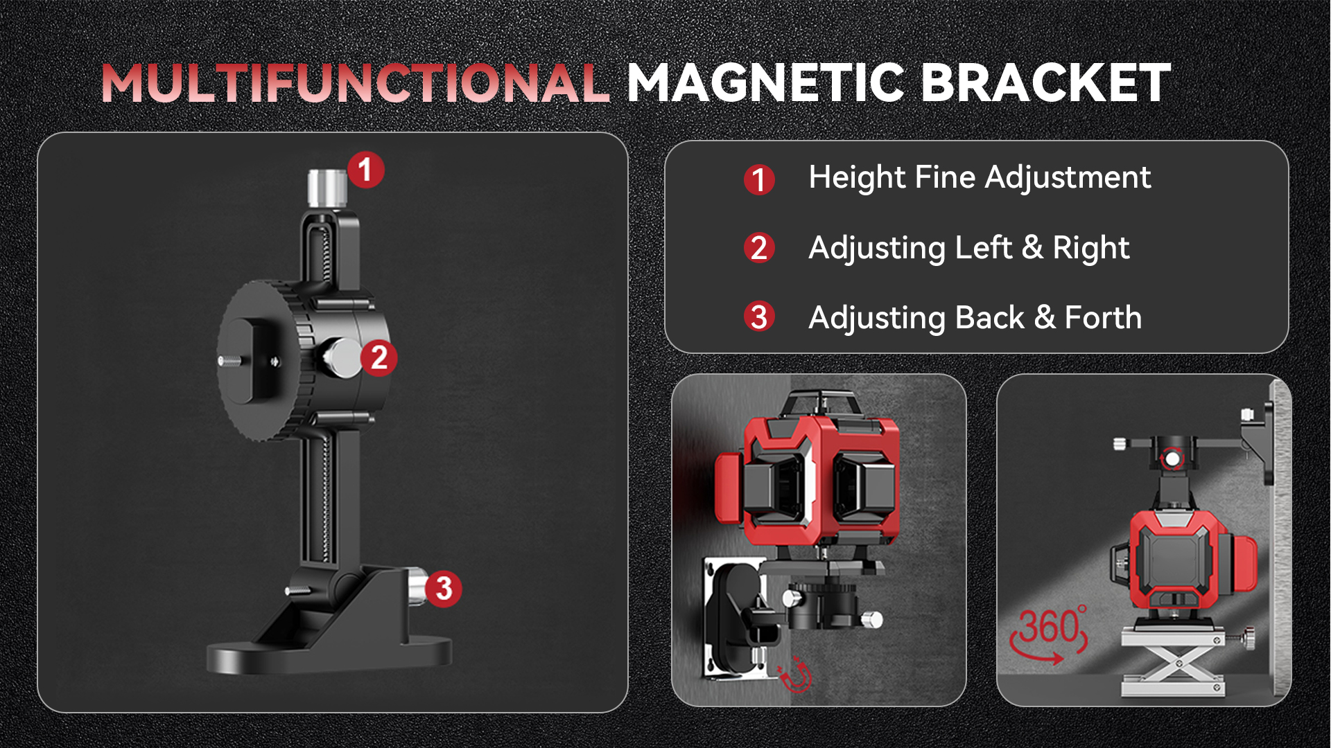 This device is compatible with both 1/4" and 5/8" tripods. The variety of mounting options makes it a versatile and straightforward tool to set up. With its simple operation, the device takes care of the hard work, ensuring everything is perfectly aligned without requiring much effort on your part. Its sturdy mounting bracket enhances versatility, enabling easy attachment to various surfaces.