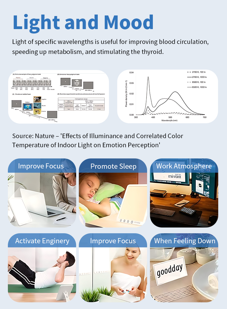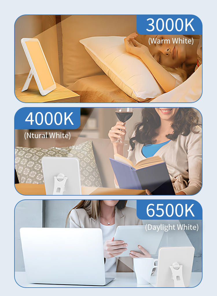 Our light therapy lamp offers 3 colour temperature modes: Warm Light (3000K), Natural Light (4000K), and Cool Light (6500K). Simply touch the button to switch between light colours. Whether you need the warm, comforting light for relaxation or the bright, cool light for focused work, you can set the most suitable lighting atmosphere based on distance, environment, and light sensitivity.